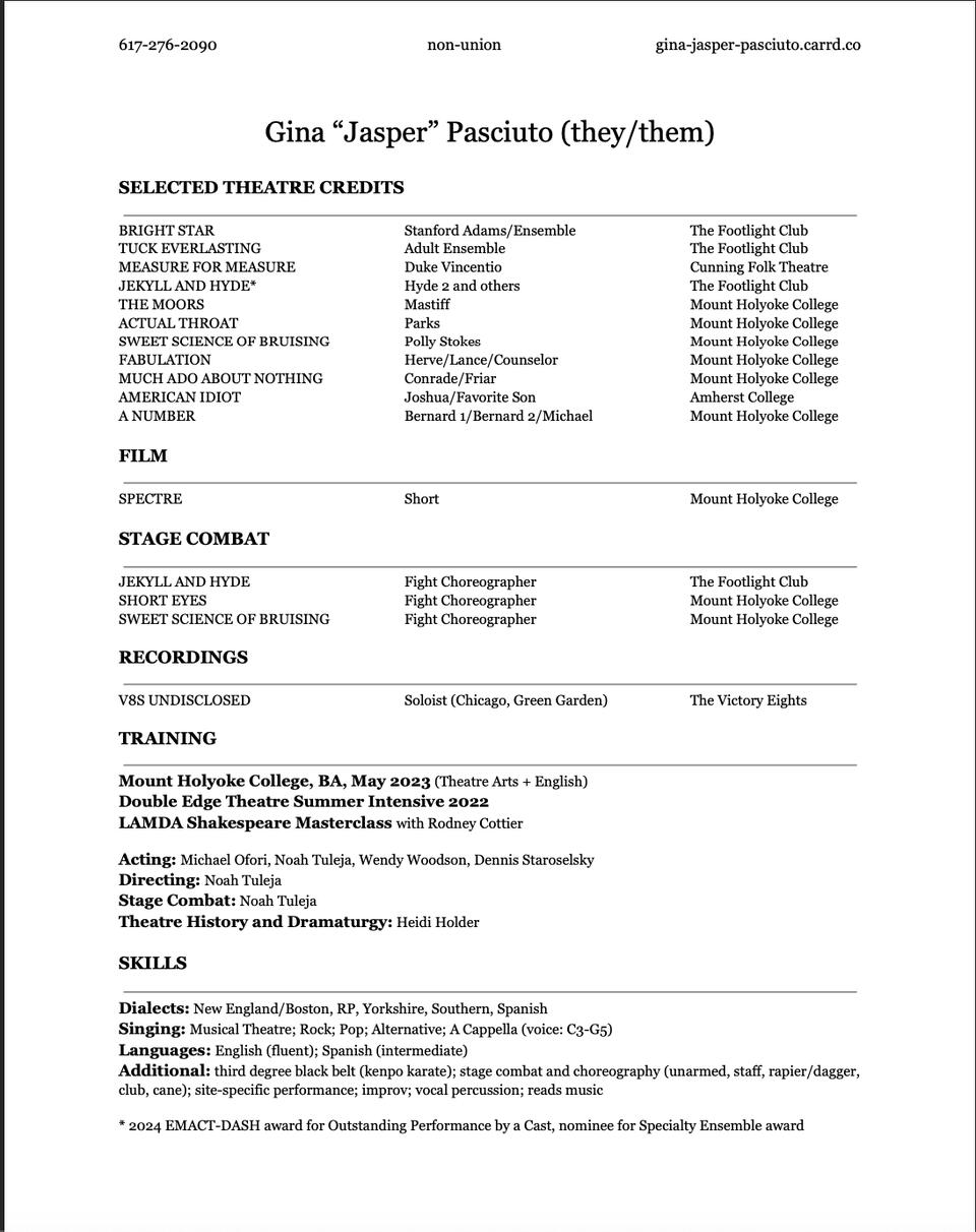 gina "jasper" pasciuto (they/them) is an actor, singer, and combat choreographer based in boston, ma. their most recent credits include bright star (the footlight club), measure for measure (cunning folk theatre), and dr. jekyll and mr. hyde (the footlight club), for which they won an emact-dash award for outstanding performance by a cast.they received their ba in english and theatre arts from mount holyoke college in 2023.their theatrical passions include surrealism, horror, new works, ensemble crafting, queer and trans narratives, and making men into butches.when not playing pretend and throwing punches, jasper can be found fighting for their life on the mbta (the mbta usually wins).